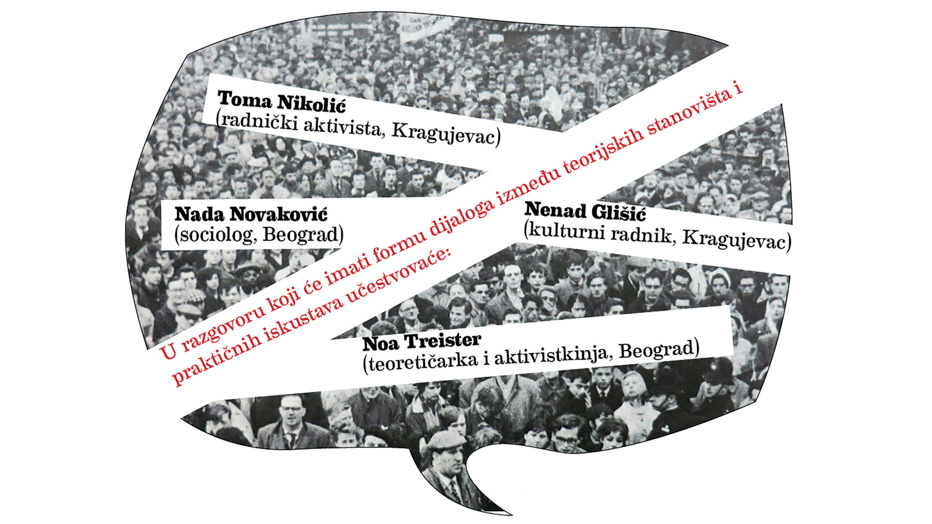 У разговору који ће имати форму дијалога измеđу теоријских становишта и практичних искустава учествоваће Тома Николић (раднички активиста), Нада Новаковић (социолог), Ноа Треистер (теоретичарка и активисткиња) и Ненад Глишић (културни радник).